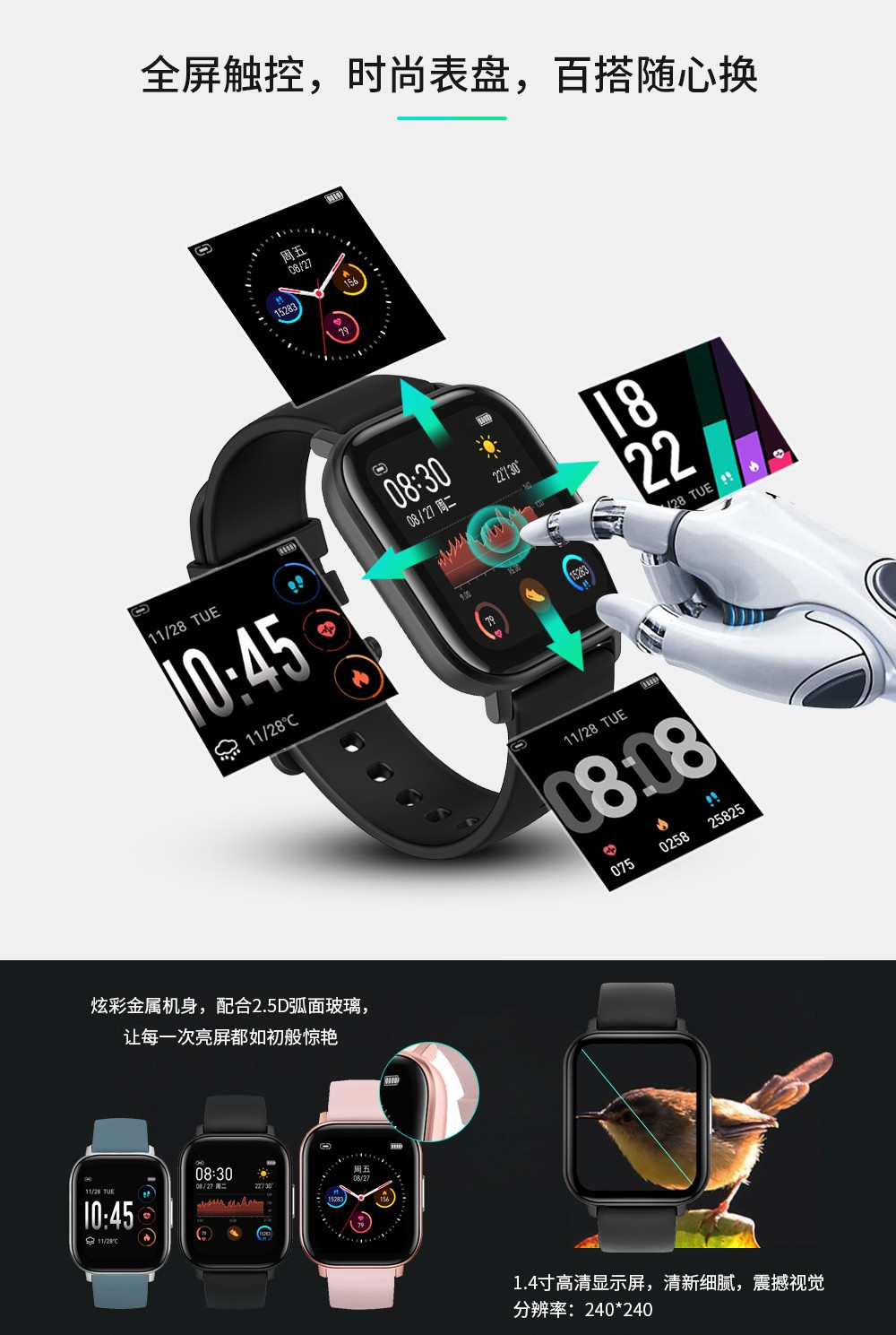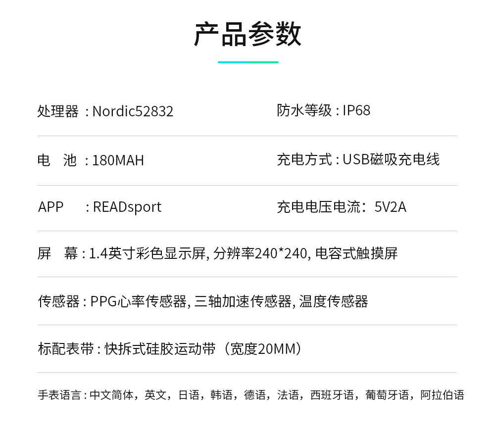 產(chǎn)品類型:智能穿戴? ? ? ? ? ? ? ? ? ? ? ? ? |? ?信息推送:支持 屏幕尺寸:1.4inch? ? ? ? ? ? ? ? ? ? ? ? ? ? |? ?來電提醒:支持 分辨率:240*240? ? ? ? ? ? ? ? ? ? ? ? ? ? ?|? ?防水:IP68 操作平臺:NRF52832? ? ? ? ? ? ? ? ? ? ? ?|? ?震動(dòng)模式:支持 材質(zhì):鋅合金? ? ? ? ? ? ? ? ? ? ? ? ? ? ? ? ? ? |? ?側(cè)鍵:支持 內(nèi)存:64KB+512KB? ? ? ? ? ? ? ? ? ? ? ? ?|? ?充電器:磁鐵彈簧針 存儲:64M bit? ? ? ? ? ? ? ? ? ? ? ? ? ? ? ? ? |? ?GPS:不支持 功能介紹? ? ? ? ? ? ? ? ? ? ? ? ? ? ? ? ? ? ? ? ? ?|? ? APP:支持專門APP 藍(lán)牙:藍(lán)牙 4.0, 支持安卓和iOS系統(tǒng)? ?|? ?語言:多語言 多運(yùn)動(dòng)模式:支持? ? ? ? ? ? ? ? ? ? ? ? ? ? ? |? ?手表語言:APP語言 心率測試:3300光學(xué)心率傳感器? ? ? ? |? ? 說明書語言:手表語言 體溫測試:支持? ? ? ? ? ? ? ? ? ? ? ? ? ? ? ? ?|? ? 結(jié)構(gòu)特點(diǎn) 呼吸功能:支持? ? ? ? ? ? ? ? ? ? ? ? ? ? ? ? ?|? ? 尺寸:43.25*36.25*9.5mm 節(jié)拍器:支持? ? ? ? ? ? ? ? ? ? ? ? ? ? ? ? ? ? |? ? 電池:180MA 計(jì)步器:支持? ? ? ? ? ? ? ? ? ? ? ? ? ? ? ? ? ? |? ? 顏色:玫瑰金,黑色,銀色 睡眠監(jiān)測:支持? ? ? ? ? ? ? ? ? ? ? ? ? ? ? ? ?|? ?包裝尺寸:102*83*68MM G-傳感器:支持
